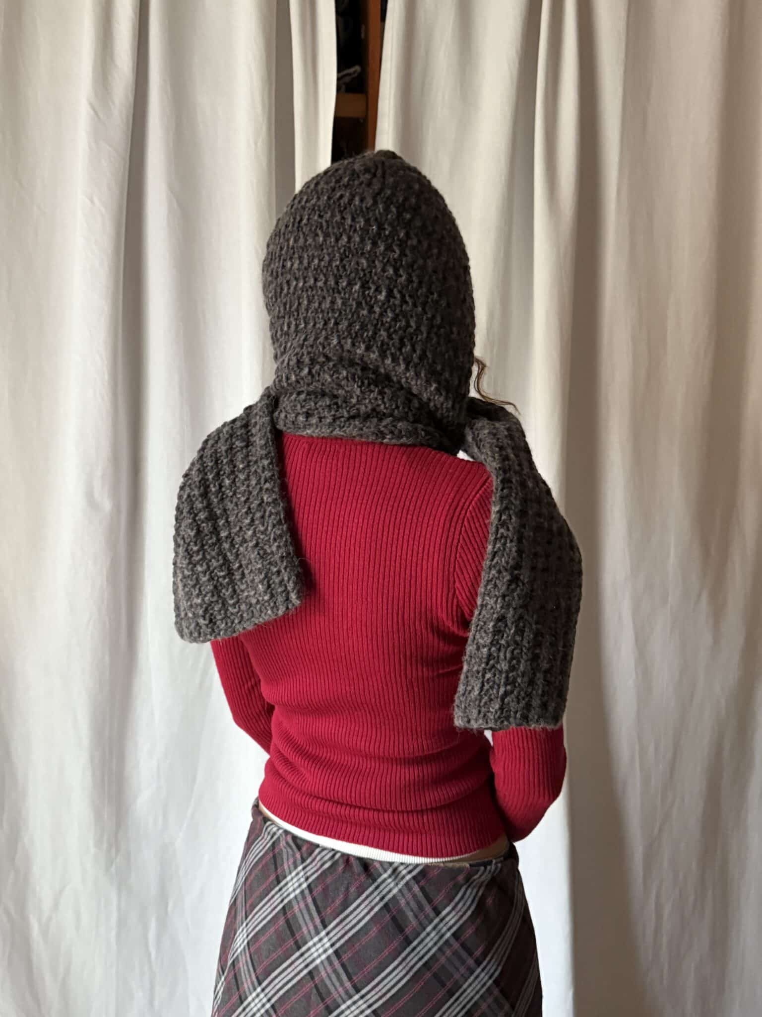 Knitted hooded scarf made from wool with a textured surface and integrated hood design