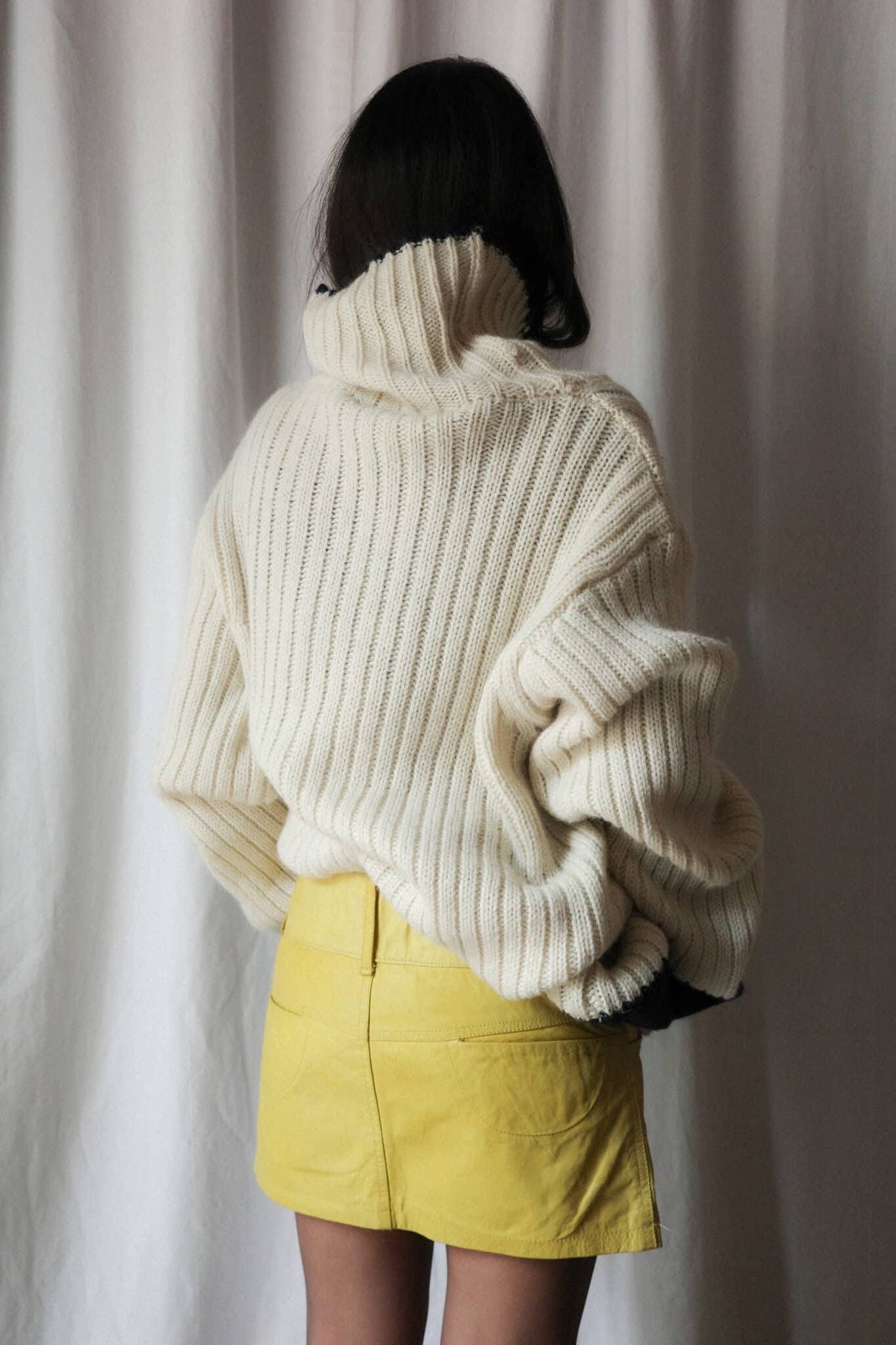 yellow leather mini skirt with a straight silhouette and structured waistband. smooth leather finish and minimal detailing